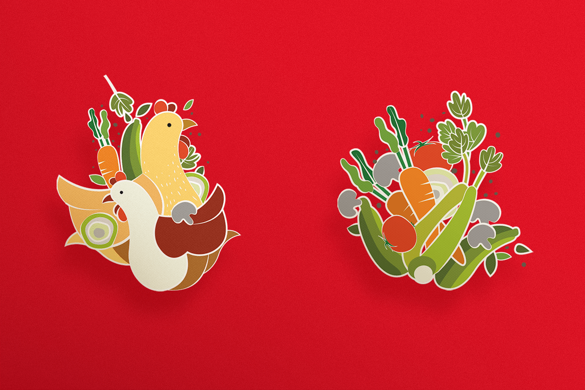 Realizamos el diseño de las etiquetas a partir de la combinación de sabores e ingredientes que hacen de los platillos una experiencia gustativa inigualable. Por cada concentrado creamos una ilustración dinámica que combina los ingredientes característicos de cada uno, empleando figuras orgánicas con colores cálidos. -