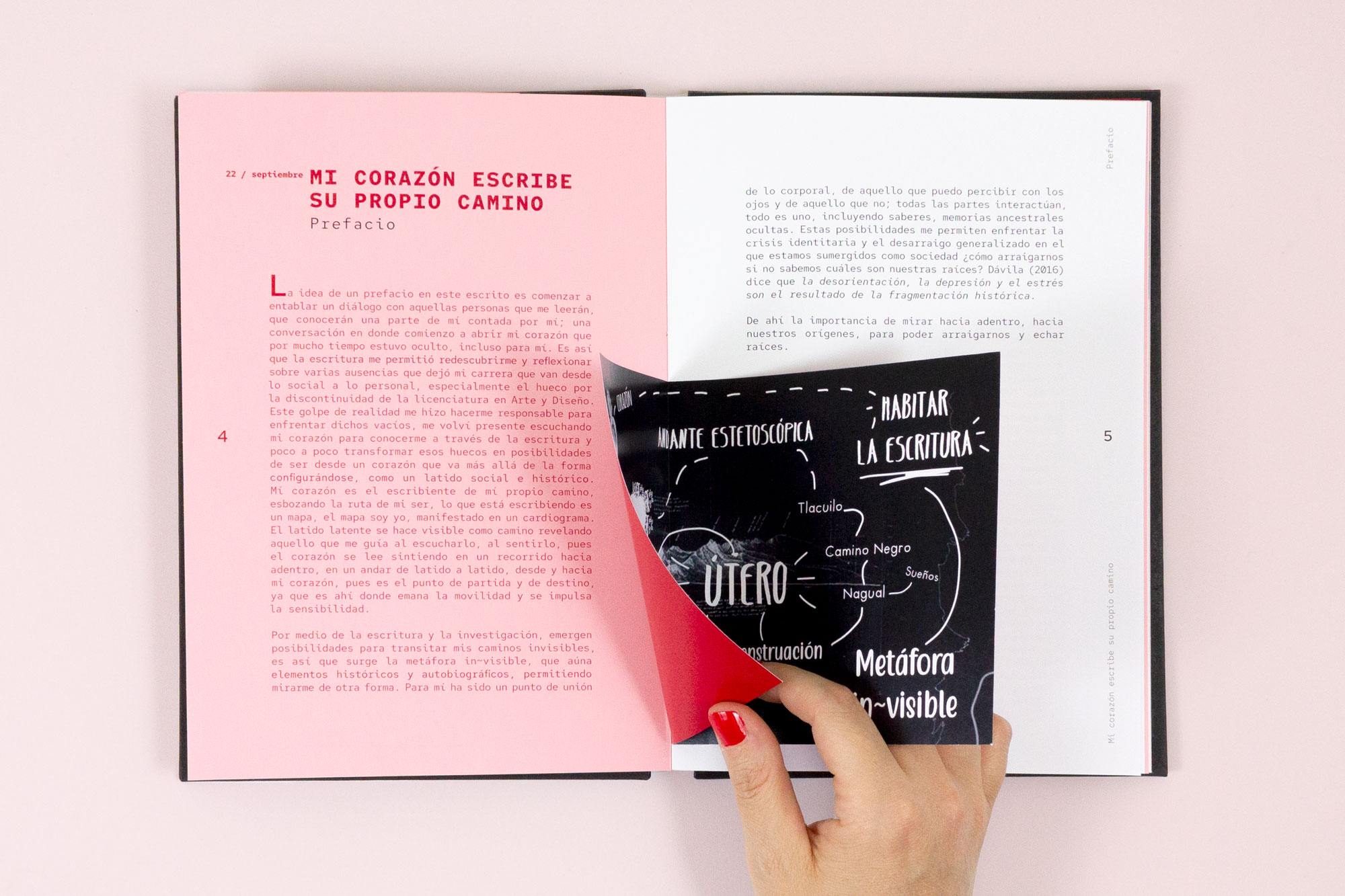 En la creación del libro objeto, el color del papel juega entre el negro, rosa y rojo para remitir a los colores del corazón y del cuerpo. Los lectores pueden interactuar con distintos elementos del libro y la lectura se vuelve dinámica. Las transparencias en los materiales que utilizamos para Latido Latente nos muestran lo que hay dentro de este cuerpo, pues el camino que sigue la autora es “...habitar la escritura para descubrir los caminos que están dentro trazados por el pasado, memorias y experiencias necesarias para mi construcción como sujeto artista-diseñador.” (Rojas, Matilde) -