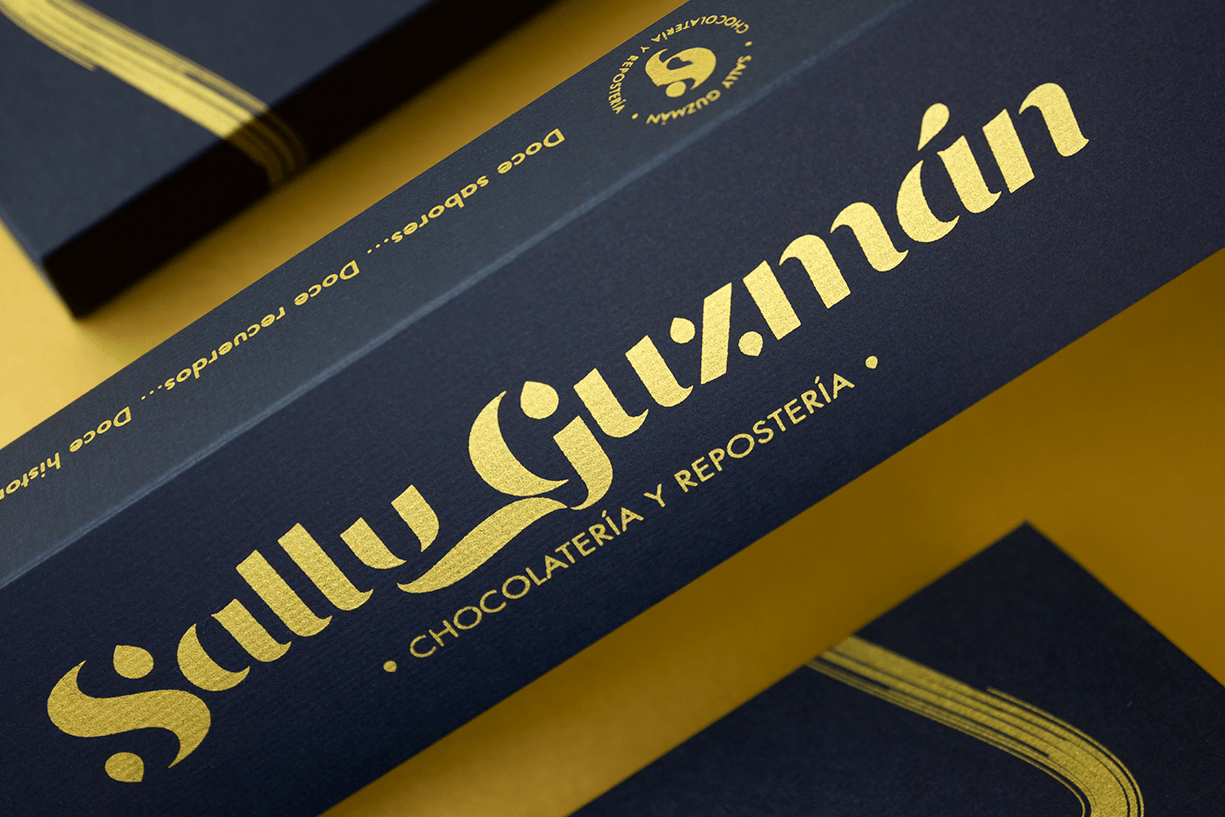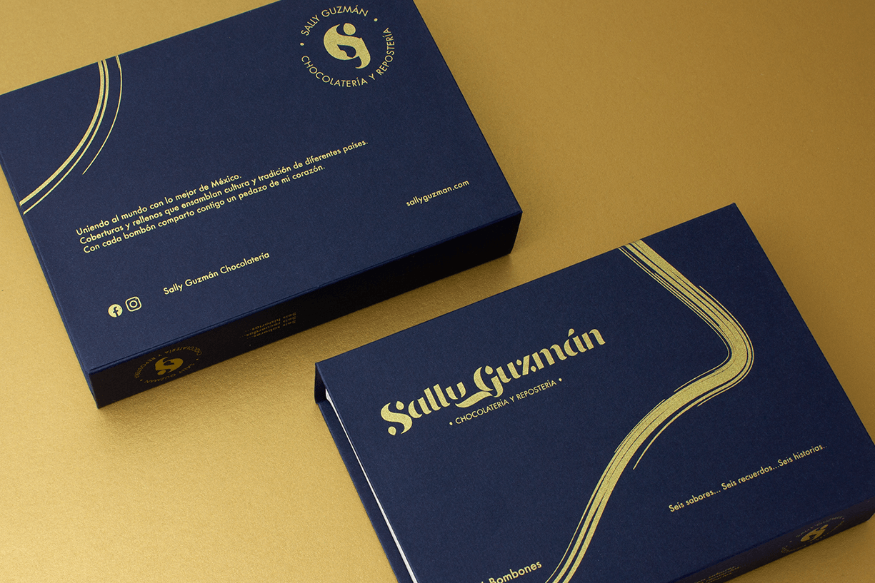 Diseñamos dos empaques con la identidad de la marca, donde destacan los colores azul marino y dorado. Sobre un material texturizado, resaltamos el trabajo artesanal de la repostería a través de una pincelada que alude al logotipo de Sally Guzmán, lo cual resulta en un empaque elegante y fino. -