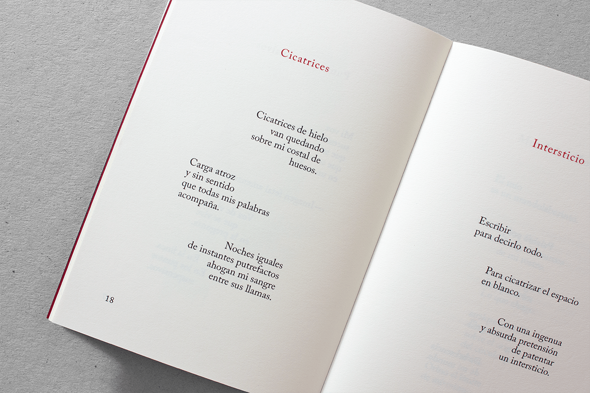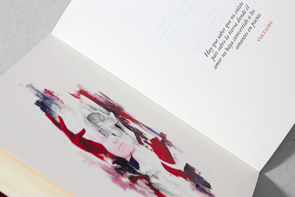 Nuestro diseño del libro resalta los versos de forma dinámica en un formato pequeño. La tipografía que elegimos es Caslon, de Baskerville, con tipos anchos y de contrastes finos que transmiten sobriedad y fuerza. El contenido gráfico complementa la naturaleza pasional e íntima de los poemas sobre un amor que nunca concluyó. -
