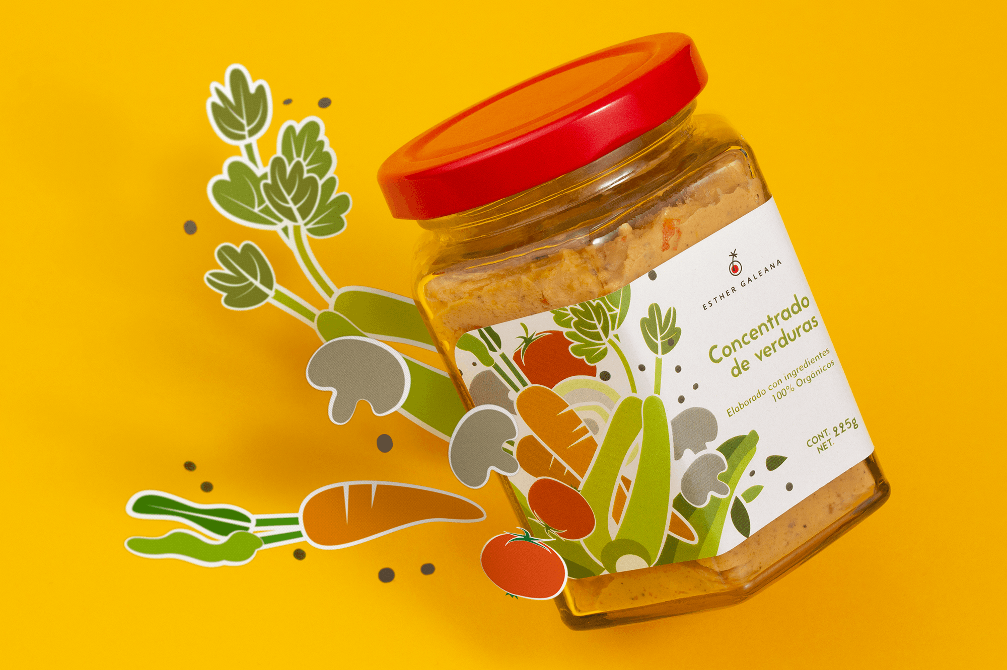 Realizamos el diseño de las etiquetas a partir de la combinación de sabores e ingredientes que hacen de los platillos una experiencia gustativa inigualable. Por cada concentrado creamos una ilustración dinámica que combina los ingredientes característicos de cada uno, empleando figuras orgánicas con colores cálidos. -