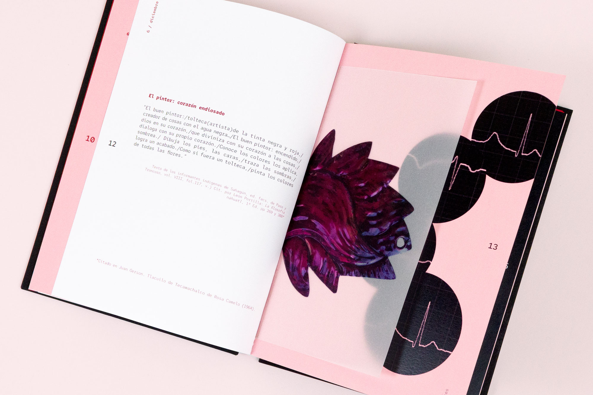 En la creación del libro objeto, el color del papel juega entre el negro, rosa y rojo para remitir a los colores del corazón y del cuerpo. Los lectores pueden interactuar con distintos elementos del libro y la lectura se vuelve dinámica. Las transparencias en los materiales que utilizamos para Latido Latente nos muestran lo que hay dentro de este cuerpo, pues el camino que sigue la autora es “...habitar la escritura para descubrir los caminos que están dentro trazados por el pasado, memorias y experiencias necesarias para mi construcción como sujeto artista-diseñador.” (Rojas, Matilde) -