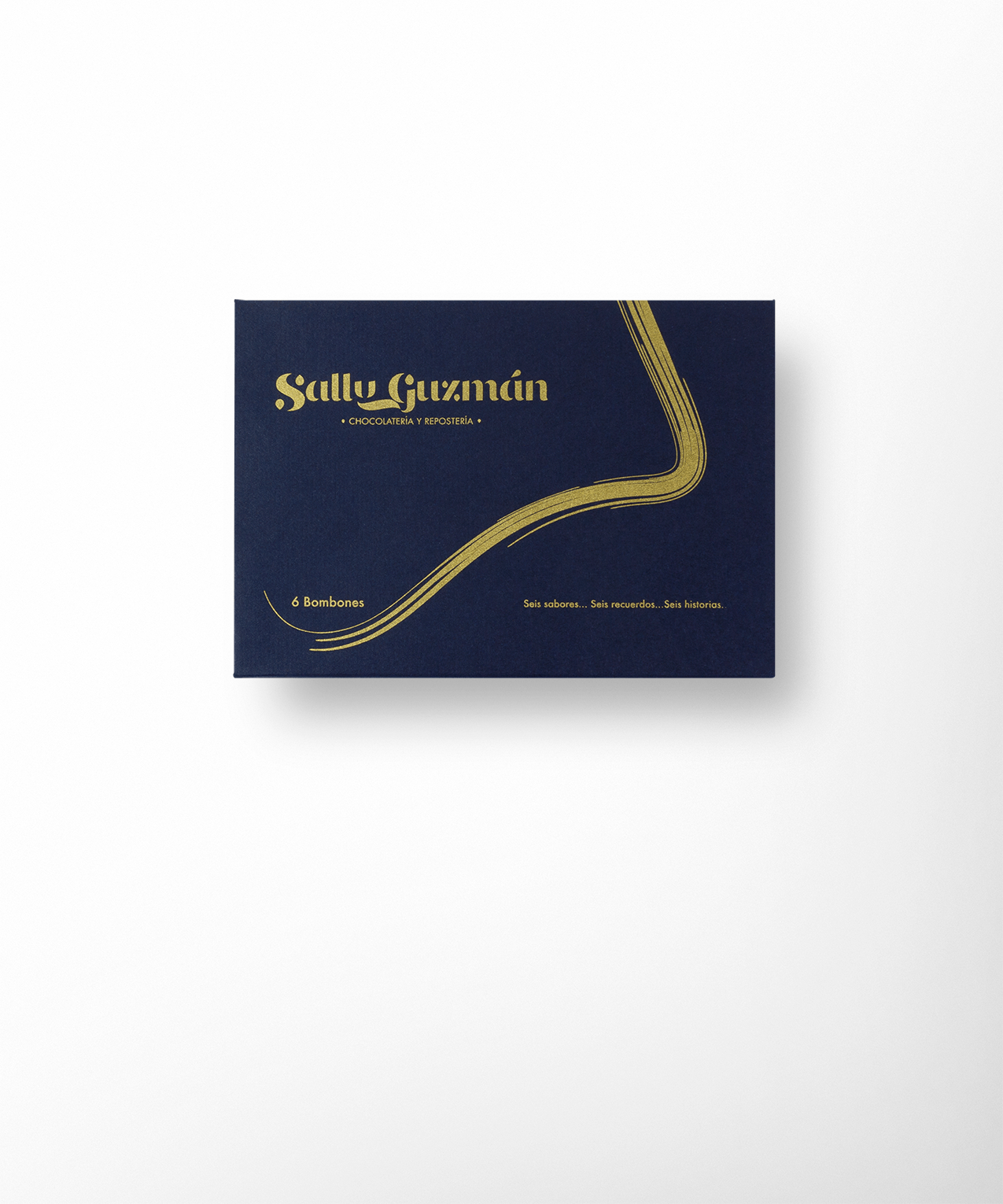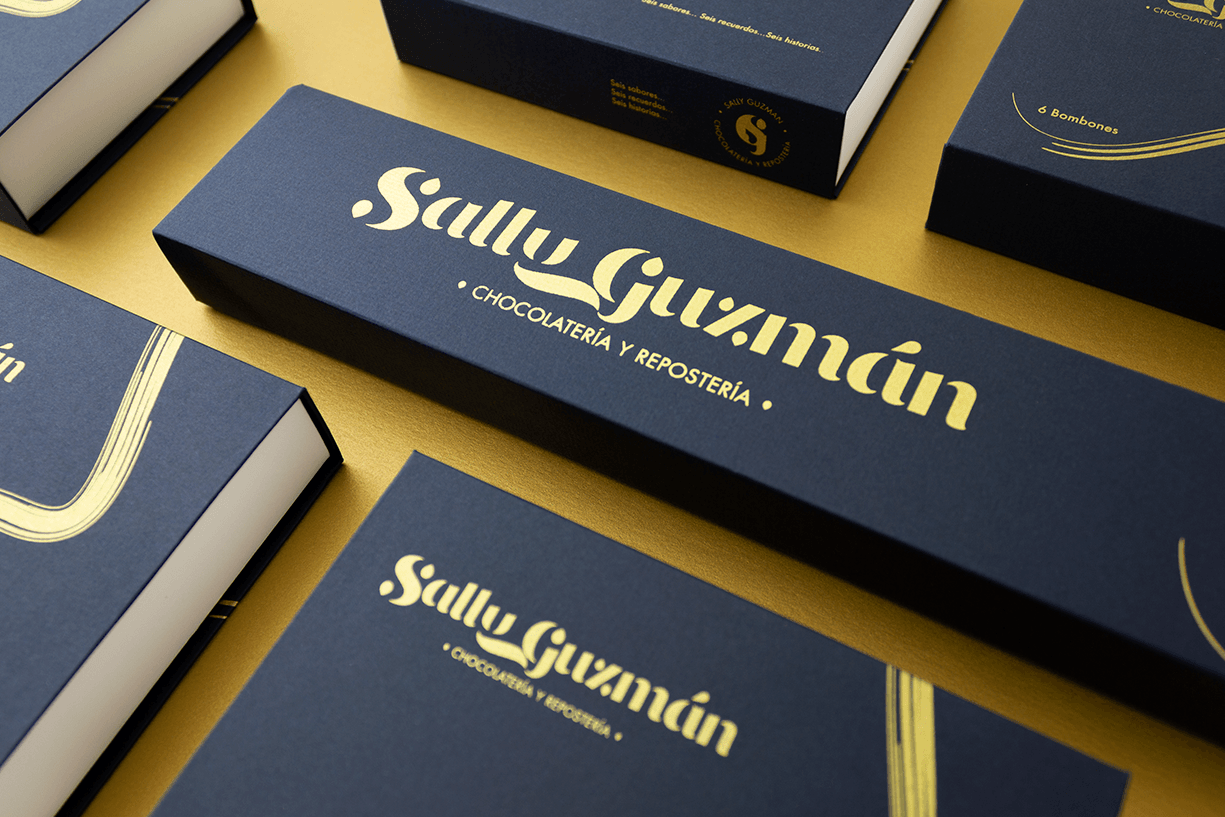 Diseñamos dos empaques con la identidad de la marca, donde destacan los colores azul marino y dorado. Sobre un material texturizado, resaltamos el trabajo artesanal de la repostería a través de una pincelada que alude al logotipo de Sally Guzmán, lo cual resulta en un empaque elegante y fino. -